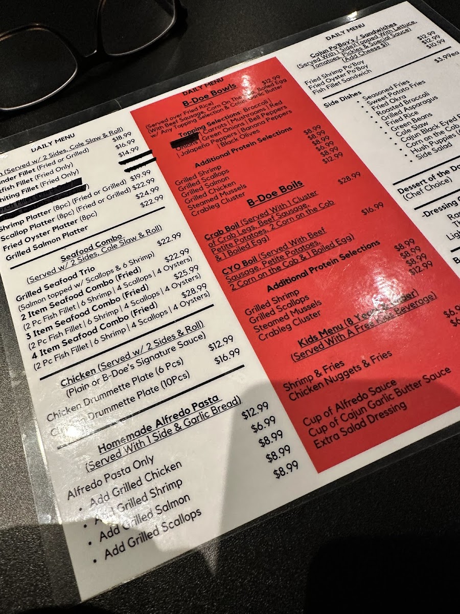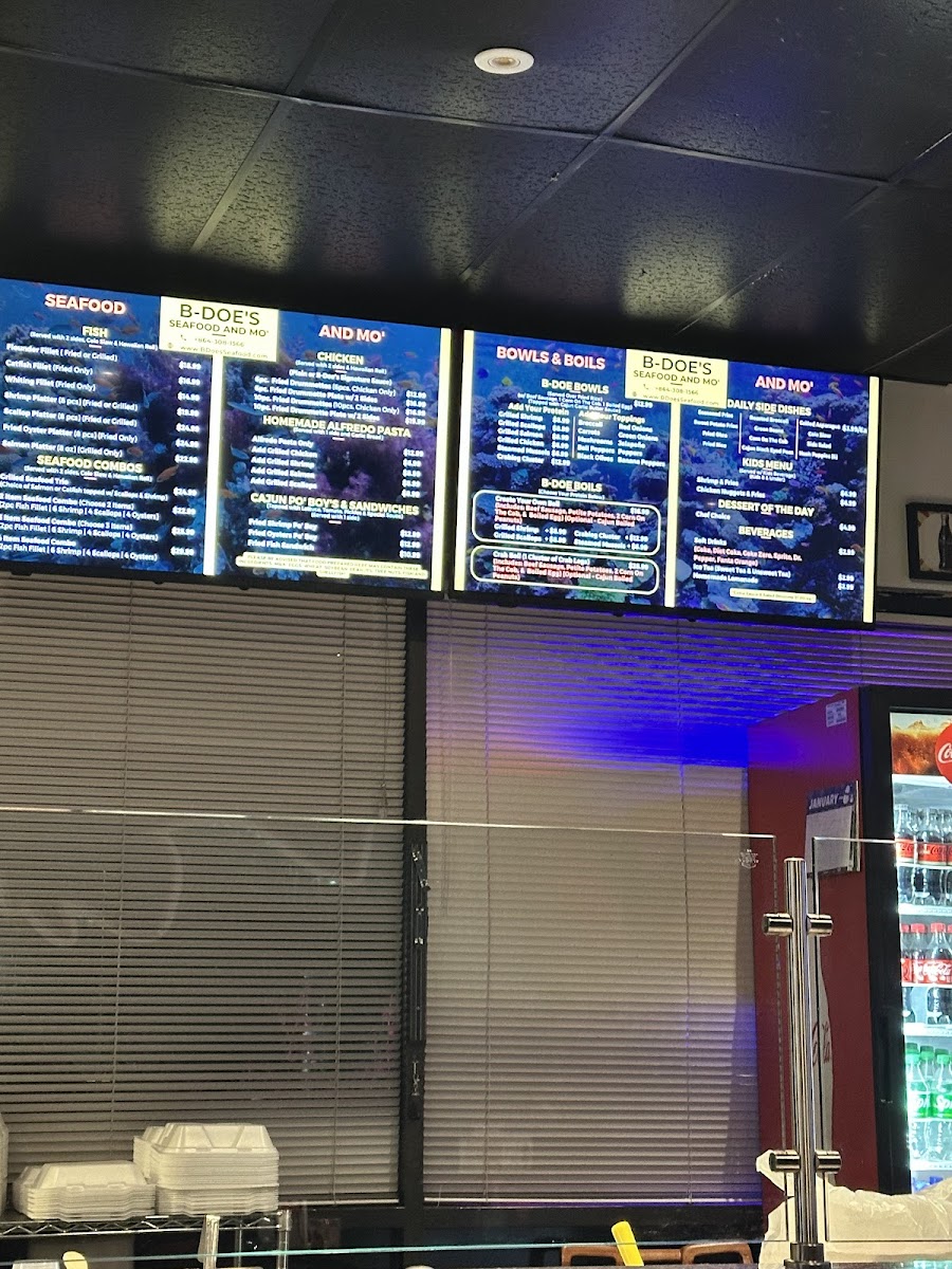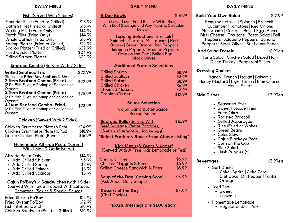 B-Doe's Seafood & More offers a diverse menu that caters to seafood lovers and those craving comfort food alike. Their Boils section features the Crab Boil and CYO Boil, alongside the indulgent Ultimate BoilCrab & Shrimp Boil. For chicken enthusiasts, options like the 10 Fried Drummettes and various Fried Drummette Plates, such as the 6pc - Fried Drummette Plate W/ 2 Sides, are available. The restaurant’s sides include favorites like Corn On The Cob, Hush Puppies (6), and Fried Okra. Guests can also enjoy hearty bowls like the B-Doe Bowl (Fried Rice) or B-Doe Bowl (White Rice), served with garlic bread. For seafood lovers, the 2 Item Seafood Combo (Fried Only), 3 Item Seafood Combo (Fried Only), and the Grilled Seafood Trio offer tasty choices, with each combo accompanied by two sides. The 8 Pc Shrimp Platter (fried or grilled) and Catfish Fillet are also great options, while Crab Leg Cluster and Salmon can be added to any meal as individual items. For lighter fare, the Cajun Po' Boys and Fried Shrimp Po' Boy sandwiches, served with a side, stand out. There’s something for every palate, even a Chef Choice Dessert for those with a sweet tooth. Whether you're after a filling seafood feast or a tasty meal with sides and drinks like Diet Coke and Dr. Pepper, B-Doe's has you covered.